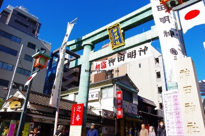 訪れたのは1月の中旬に近いころだが、まだお正月の気運が覚めていないのか神田明神の大きな鳥居の下は多くの参拝客で賑わっていた。神田明神の鳥居は大きく脇には国旗が掲揚されていた。ここより拝殿までまっすぐ行くことができるわけだが、両脇にある昔ながらの店を見るのも楽しい。