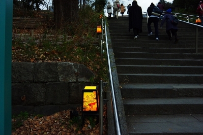 意外に高さがあるので雨の日などは注意。この階段を下れば不忍池。