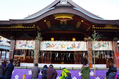 拝殿には如何にも正月を思わせる飾りがつけられ左の隅の方には「謹賀新年」の看板があった。賽銭箱の横に建てられた竹から括りつけられた紐が絵馬の方へとのびギザギザの神が付いている。 貼りつけられた緞帳や暖簾風の布は正月を迎えるにふさわしく整然と皺なくつけられていた。その下で参拝客がお辞儀などをしているのだが、これがもしどこかの誰かに今日は元旦だと言われたらそう思ってしまう風景である。