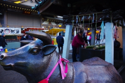 牛は明日の元旦に控えてかどこかピカついてきれいでオマケとして赤い紐のようなスカーフでもない何かしら布が巻きつけられていた。宛らこれに触ると頭がよくなると何かで読んだ記憶があるが私には不要なのかもしれない。 正月も初詣の待ち時間に暇を持て余した人や混雑にげんなりして祈願をあきらめた人々が触りにくりのだろう。